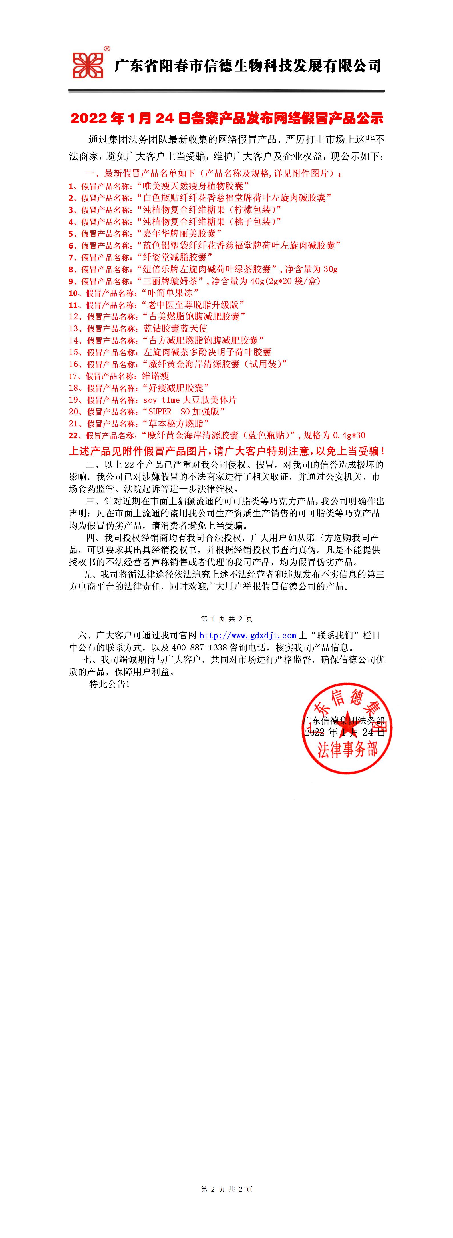 2022年1月24日备案产品发布网络假冒产品公示