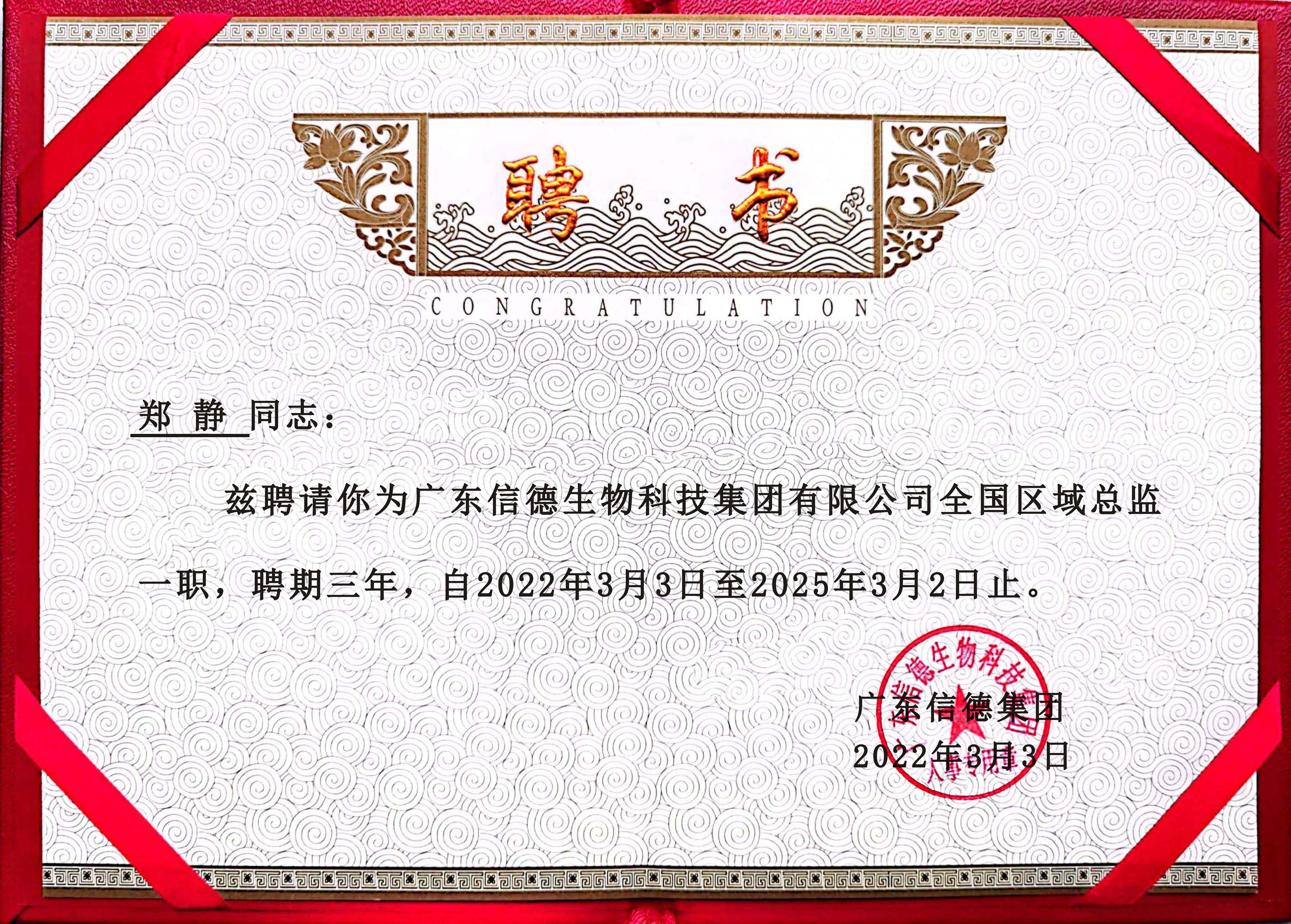 热烈祝贺电商部郑静荣升为广东信德集团全国区域总监!