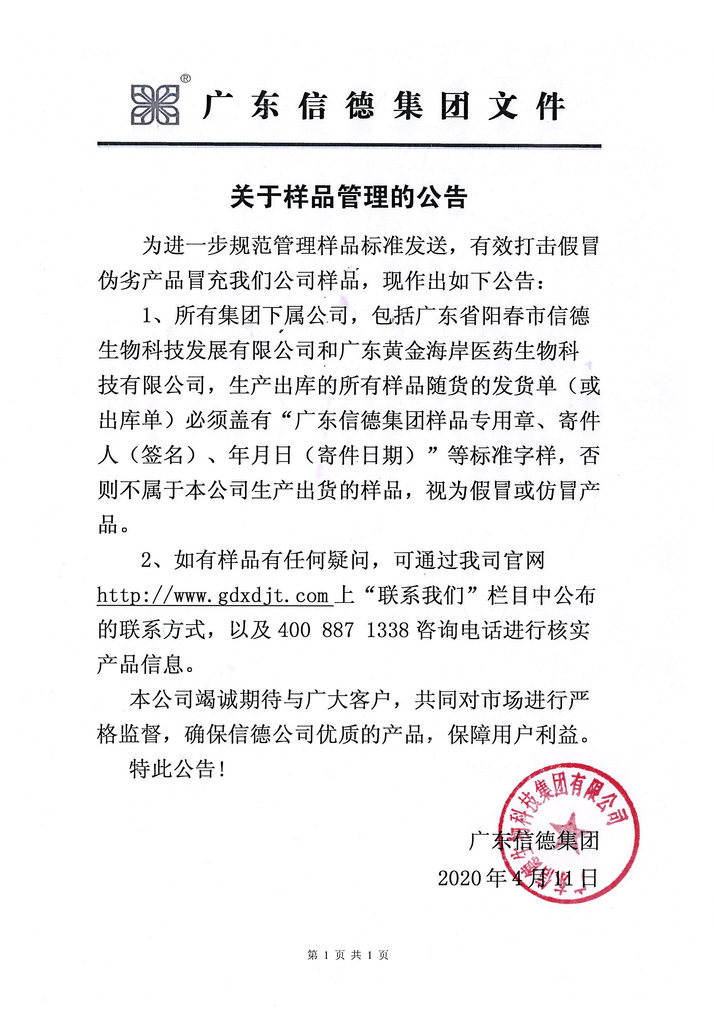 1、所有集团下属公司,包括广东省阳春市信德生物科技发展有限公司和广东黄金海岸医药生物科技有限公司,生产出库的所有样品随货的发货单(或出库单)必须盖有“广东信德集团样品专用章、寄件人(签名)、年月日(寄件日期)”等标准字样,否则不属于本公司生产出货的样品,视为假冒或仿冒产品。
